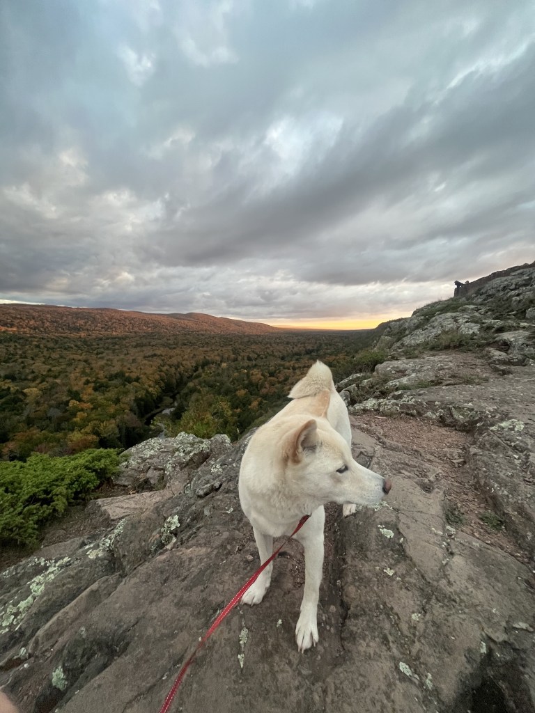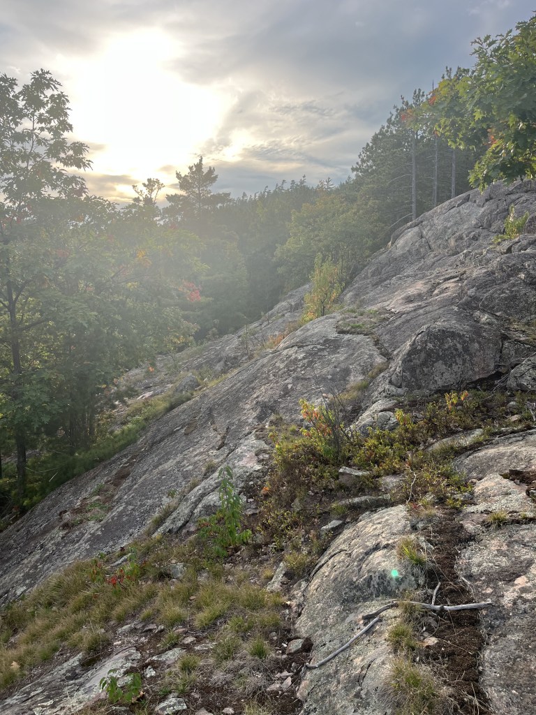 I saw lots of cool and interesting things. Near the trailhead, I found a sign about a homestead that intrigued me, so I ventured down the road to check out what they were about. I found a strange structure with some surfboards near it, which reminded me of the people who brave Lake Superior in search of the perfect wave. The tenacity of the people in the Upper Peninsula never ceases to amaze me. They have a sense of grit and independence, paradoxically mixed with strong communal bonds, that is infectious. I also found a tree that was asking to be climbed. Sadly, I couldn’t summit it, but I did get to scare some hikers by jumping out of the tree, Geronimo style, which was fun. I continued the hike until I reached the top, and I captured some cool videos on the way.